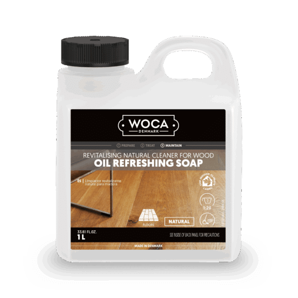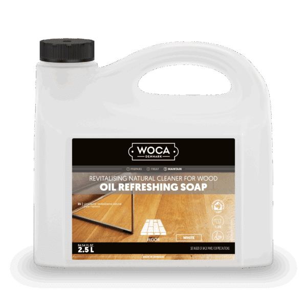 Oil and soap solution. Oil Refreshing Soap is for regular cleaning and maintenance of oiled wood floors. The natural variant is used for natural oiled and color oiled floors and the white variant for white oiled wood floors. Oil Refreshing Soap combines efficient cleaning with re-oiling as additional oil penetrates into the wood, forming a matt protective layer on the surface.